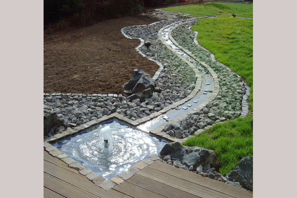 Bassin vollflächig gepflastert mit blauem Stein, Mittelache aus blauem Einzeiler